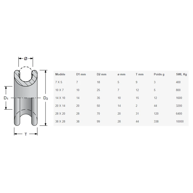 | Modèle | D1 mm | D2 mm | ø mm | T mm | Poids g | SWL Kg |