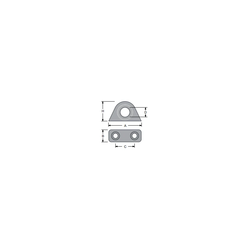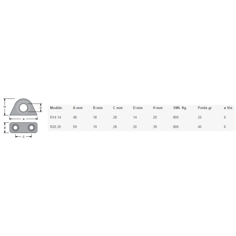 | Modèle | A mm | B mm | C mm | D mm | H mm | SWL Kg | Poids gr | ø Vis |