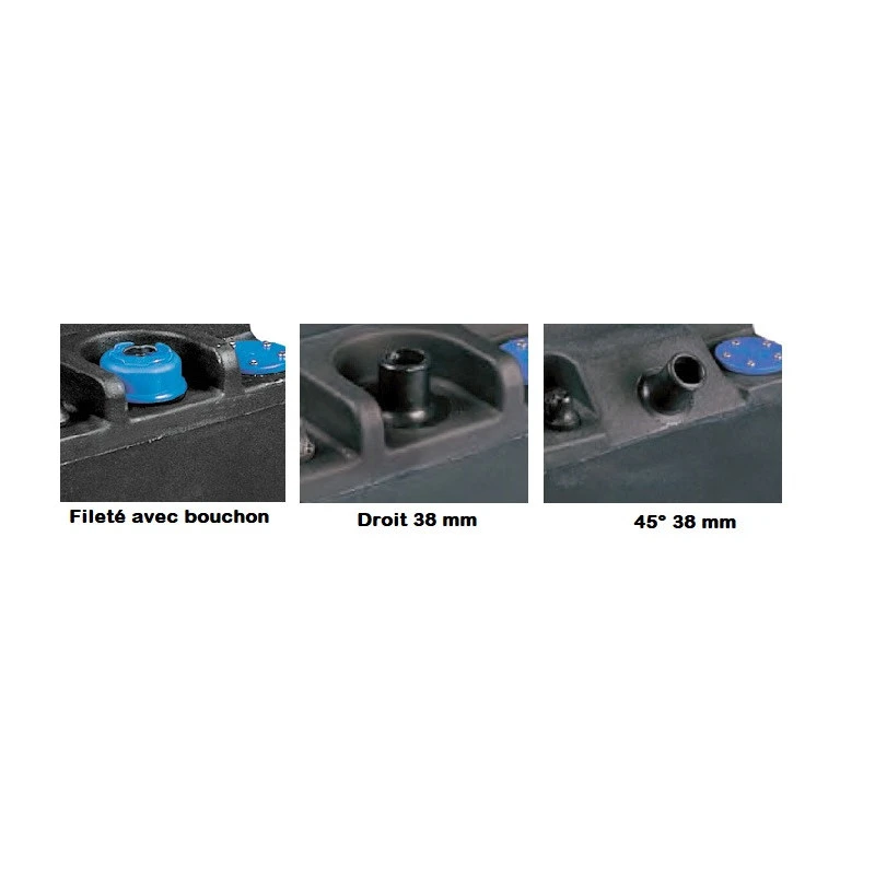 – 3 entrées remplissages : Fileté avec bouchon, Ø 38 mm droite, Ø 38 mm 45 °