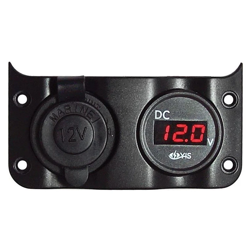 Complément optionnel ou indépendant pour tableau électrique OSCULATI Wave design, bloc voltmètre + prise de courant 12V type allume cigare, vous permettant de controler la charge et niveau de charge de vos batteries auxilaires à bord du bateau et camping-car.