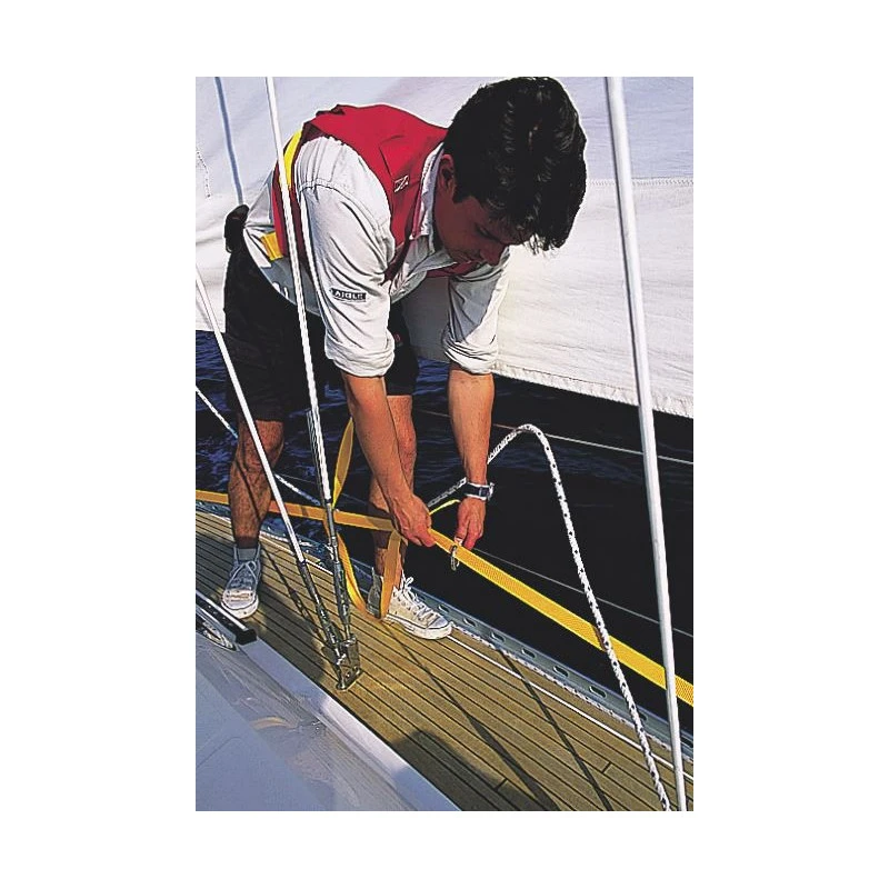 Les lignes de vie PLASTIMO permettent au navigateur de se dĂ©placer de l’arrière Ă l’avant du bateau en restant toujours sĂ©curisĂ© par le harnais et la longe. FabriquĂ©es en sangle jaune sĂ©curitĂ© de 30 mm de charge, les lignes de vie PLASTIMO ne roulent pas sous les pieds, Ă©vitant ainsi bien des accidents comparĂ© Ă un simple cordage. Leur rĂ©sistance de 2000 DaN rĂ©ponds Ă la norme en vigueur, attention nĂ©anmoins Ă les fixer solidement Ă un points d’ancrage prĂ©vu Ă cet effet comme les taquets d’amarrage et avec des manilles rĂ©sistant Ă une charge Ă©quivalente! IdĂ©alement, manilles lyre ø 10mm.