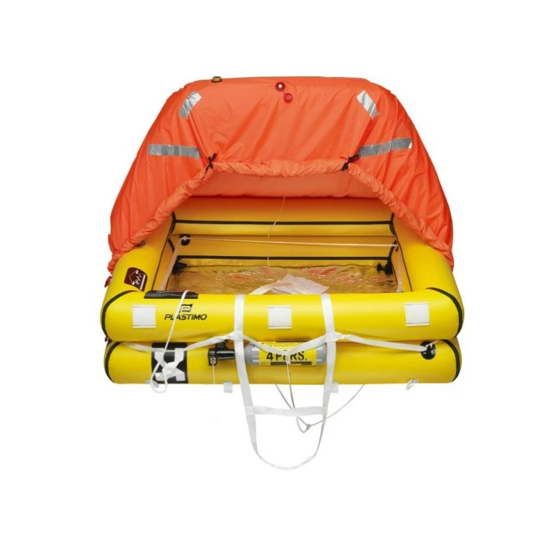 Le système d’éclairage SOLAS d’une puissance de 4,3 CD à déclenchement automatique couplé à une grande surface de bande rétro réfléchissante permet d’être repéré rapidement par tous les temps. La tête de percussion brevetée PLASTIMO offre un déclenchement de votre radeau d’une telle aisance que même un enfant ou une personne blessée peut l’activer. Le système de remontée à bord est assuré par une échelle dont le déploiement est étudié afin que vous puissiez remonter sur votre radeau même retourné.