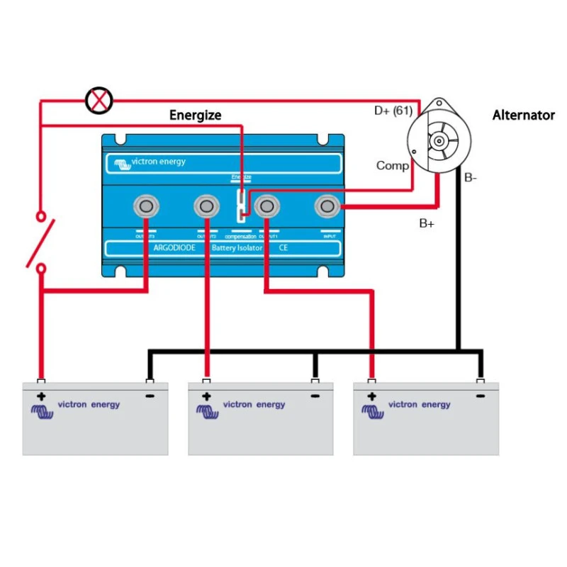 Certains alternateurs nĂ©cessite une tension d’appel sur la borne D+ pour dĂ©marrer la charge. Aussi le Argo dispose d’une borne spĂ©ciale « Energize » pour alimenter la borne D+ de l’alternateur & dĂ©marrer la charge.